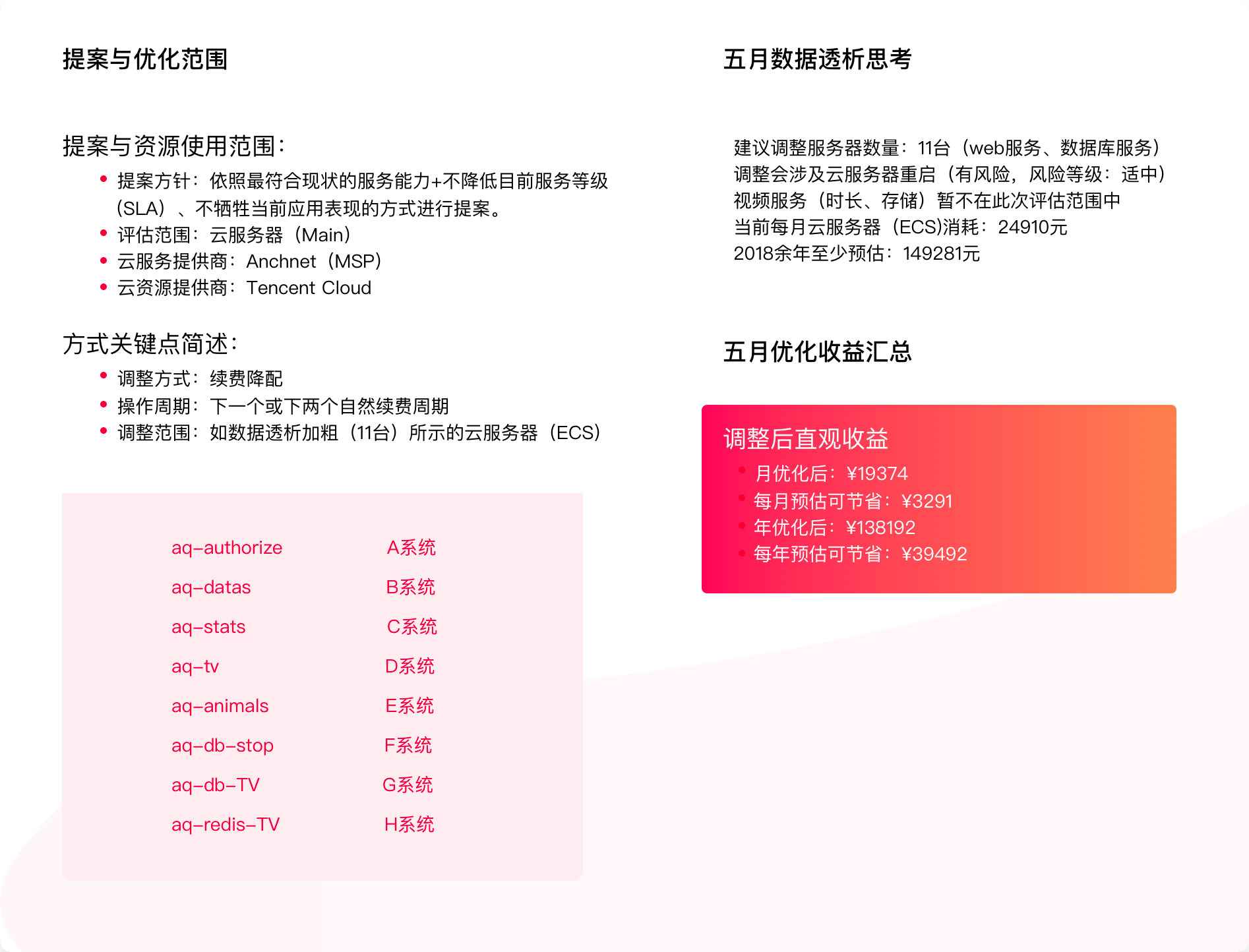选择合适的实例系列,并进行负载感知的资源规格自动升、降配;积极使用不同的存储服务,冷数据、热数据分别使用不同服务,定期分析、调整